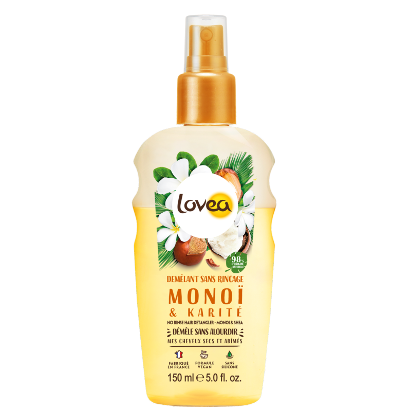 De l'Huile de Monoï et de l'Huile de Karité pour démêler facilement les cheveux secs et abîmés. En plus de sentir incroyablement bon, vos cheveux seront légers, disciplinés et lumineux.