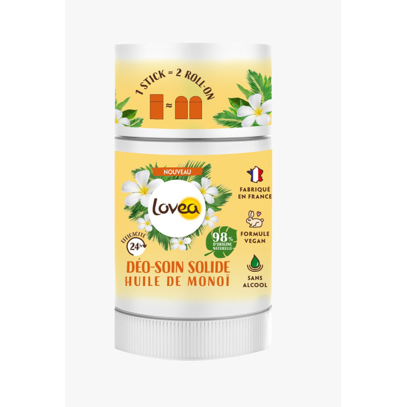 Craque pour le Déo-Soin Solide à l'Huile de Monoï Lovea. Un déodorant avec une action de soin, efficace pendant 24h. Sa texture fondante permet de l'étaler facilement sans dessécher pour une peau toute douce. Son parfum Monoï aux notes fleuries et solaires te transportera directement en vacances. Sa formule vegan, à 98% d'origine naturelle et sans alcool est enrichie en Huile de Monoï pour une sensation de soin et de confort. Ce déodorant vegan est fabriqué en France et testé sous contrôle dermatologique. Il convient à un usage quotidien. Son format stick solide est entièrement recyclable et est avantageux: 1 Stick ≈ 2 Roll-On !