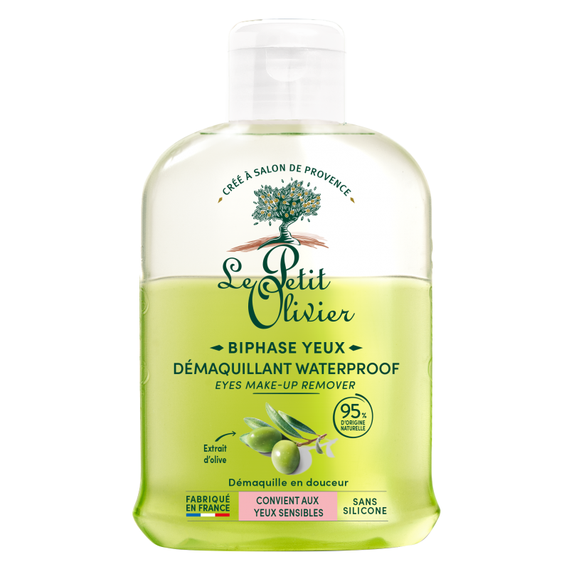 Le Démaquillant Yeux Le Petit Olivier démaquille avec soin vos cils et paupières. La phase à base d'Huile d'Olive élimine parfaitement le maquillage, même waterproof, et la phase à base d'Extrait d'Olive respecte la zone sensible du contour de l'oeil.